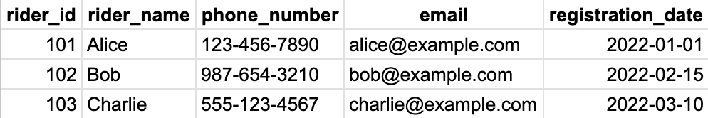 rider_idis a unique identifier for each rider.rider_namerepresents the name of the rider.phone_numbercontains the rider's contact number.emailholds the rider's email address.registration_dateindicates when the rider registered with Uber.