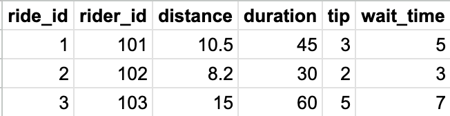 distance: The measurable distance covered during the ride.duration: The time taken for the entire ride.tip: An optional fact that represents additional financial information.wait_time: The duration between the ride request and the actual commencement of the trip.