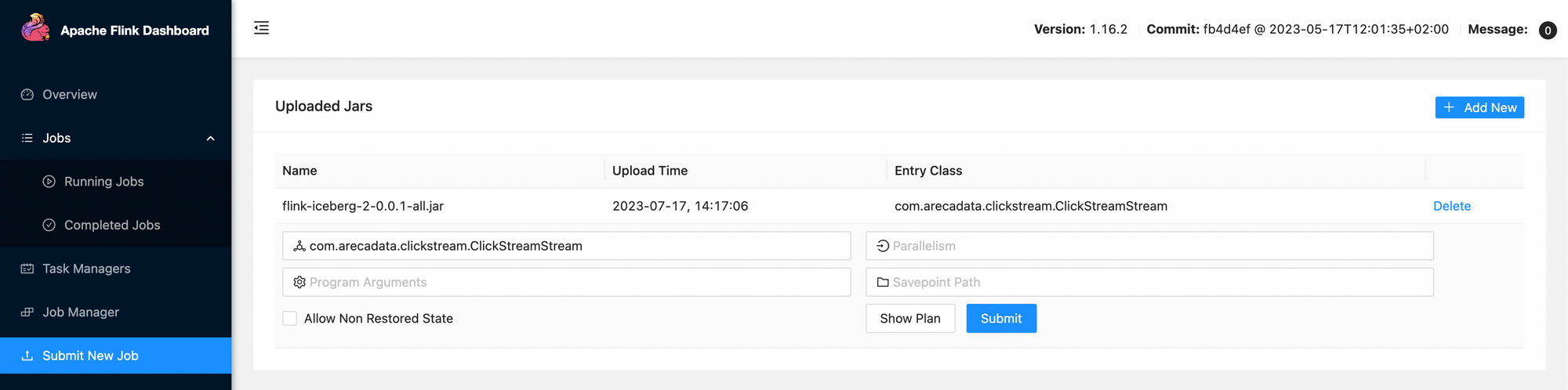 ./gradlew clean shadowJarThen head over to the Flink UI at http://localhost:8081/#/submit and submit the .jar archive we build in the previous step.