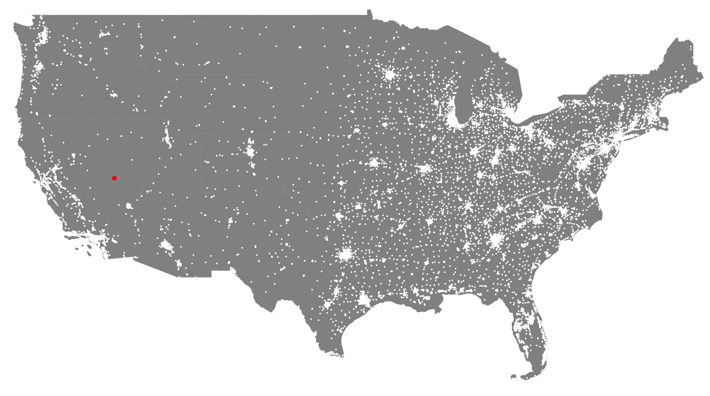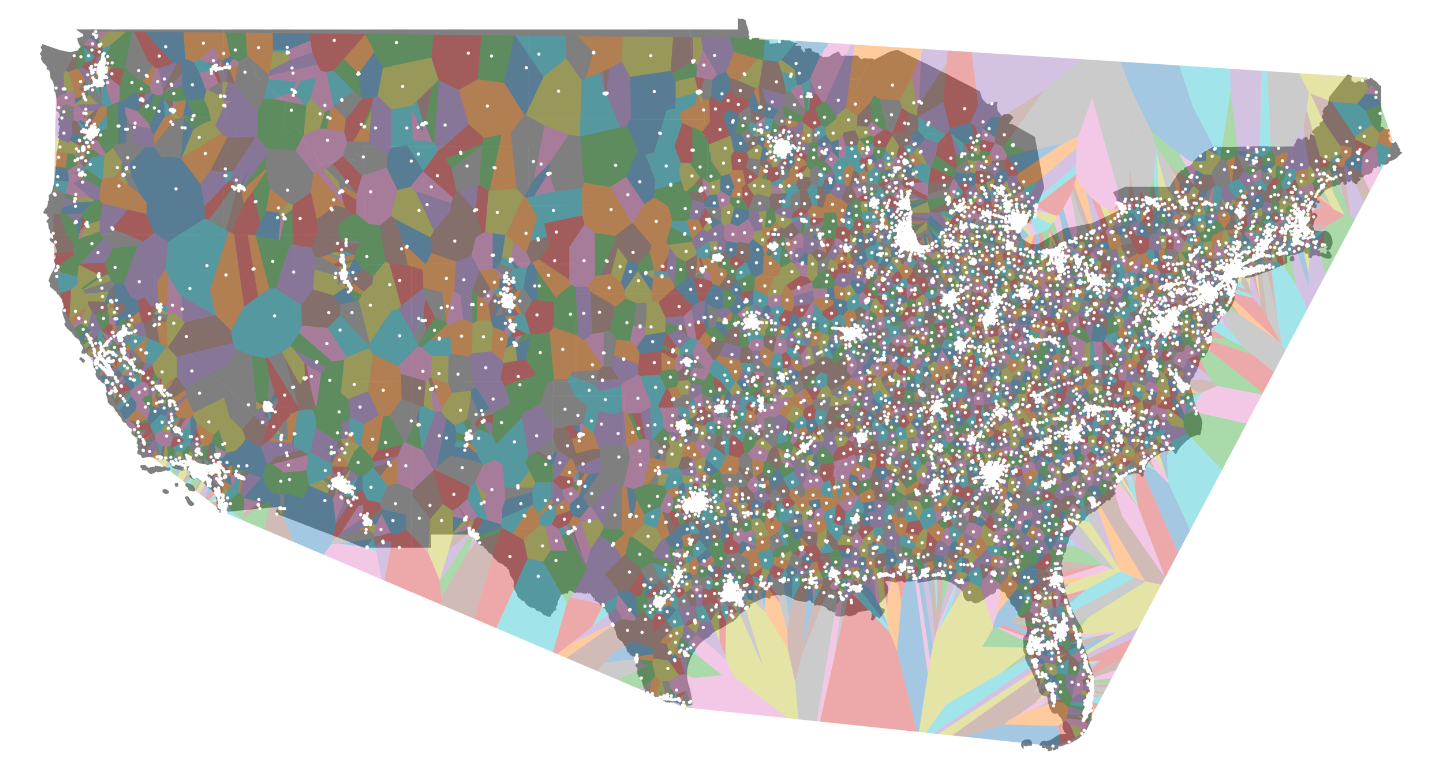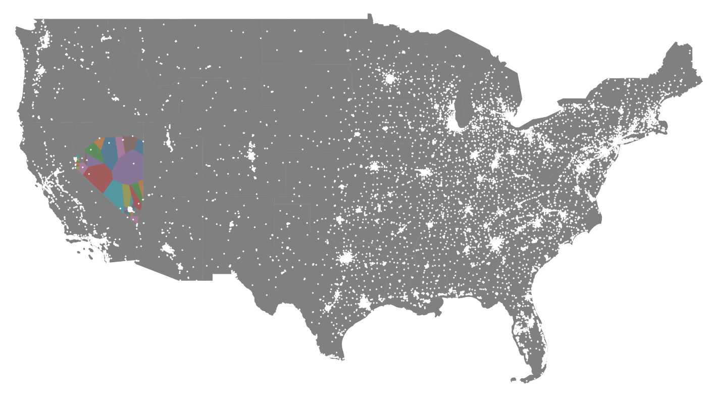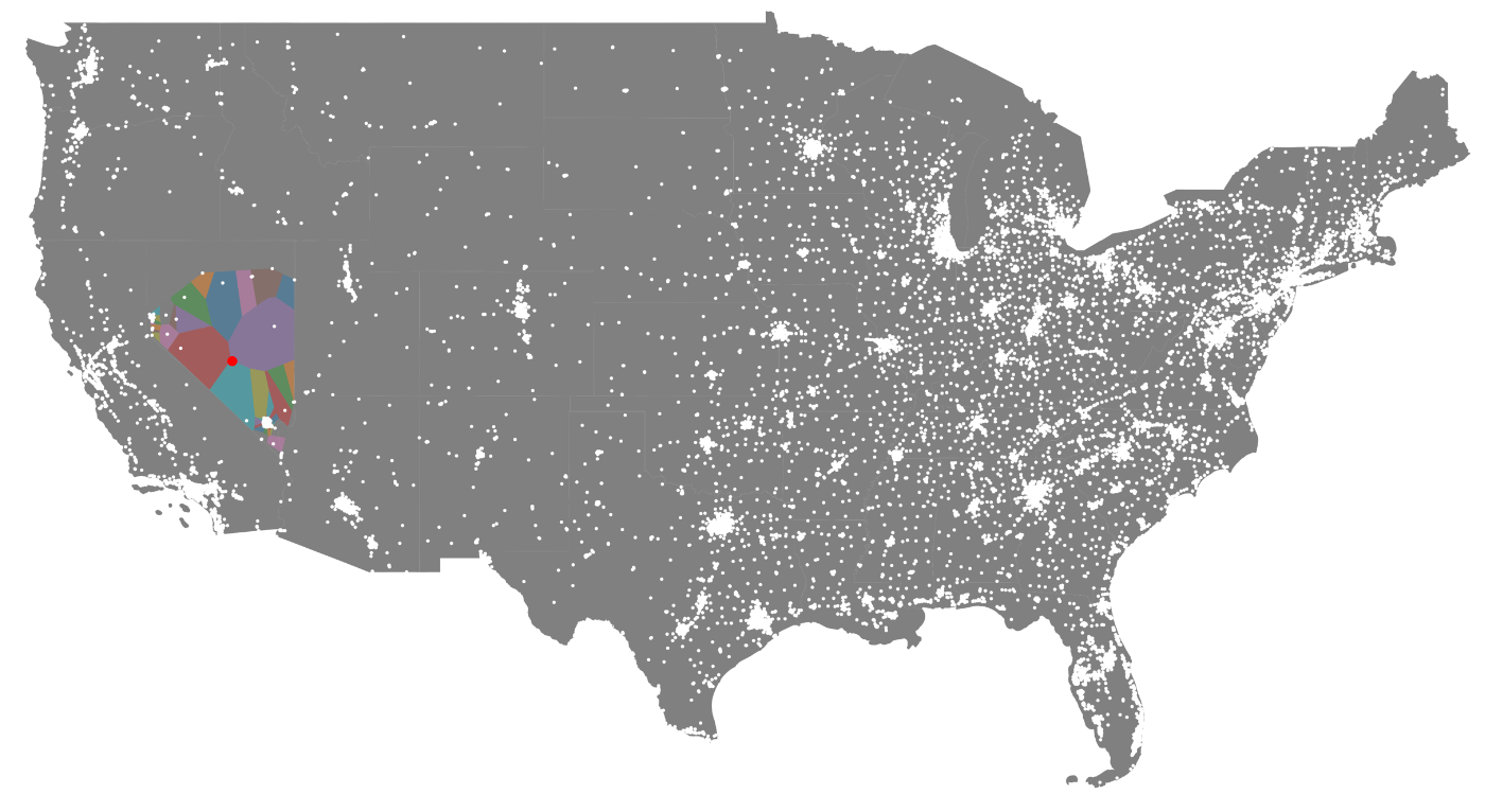 In this example, I'll show what the generated Voronoi diagram looks like for the state of Nevada. I'll show only one state because there are soo many actual locations that the full Voronoi diagram is impossible to make sense of visually.